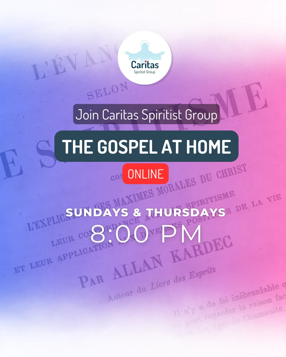 We hold weekly online meetings for Gospel study at home and bi-weekly in-person meetings for the study of the book 'The Book of Spirits' and "Mediumistic Study".